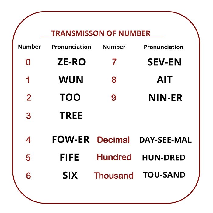 - فرکانسهای رادیویی: در ارتباطات رادیویی، خلبانان و کنترلکنندگان ترافیک هوایی باید فرکانسها را با دقت اعلام کنند. به عنوان مثال، فرکانس ۱۲۳.۴۵ MHz به صورت “One Two Three Decimal Four Five” خوانده میشود.