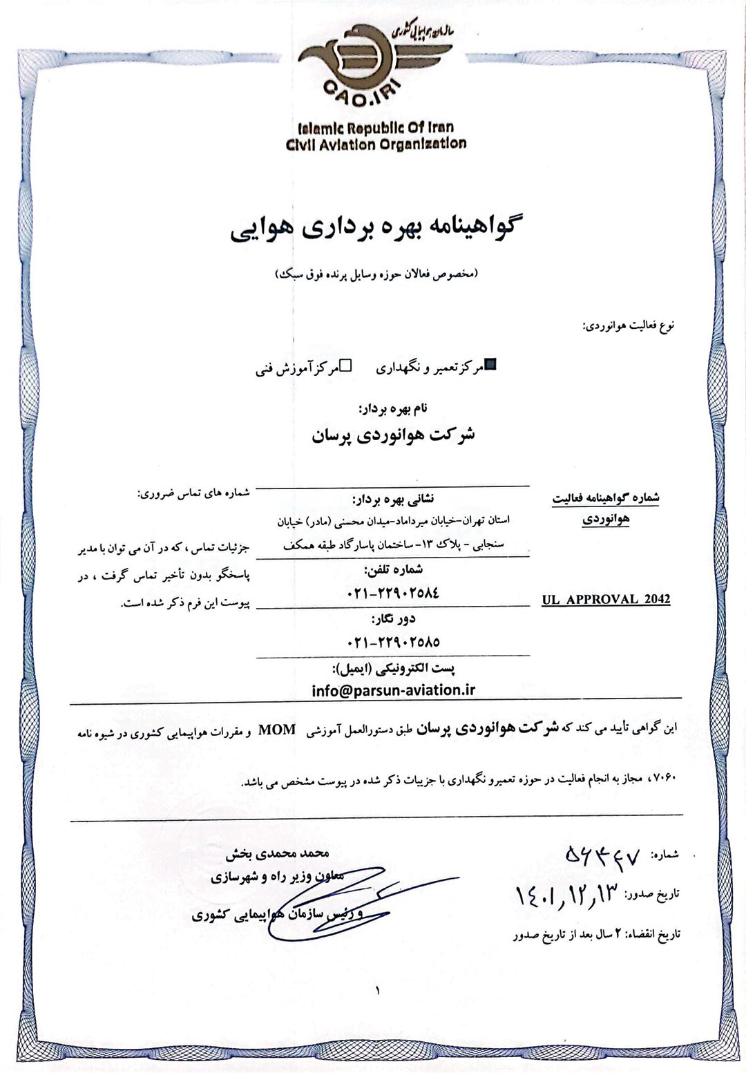 شرکت هوانوردی پرسان با کسب گواهینامه «تعمیر و نگهداری ناوگان هوایی» از سازمان هواپیمایی کشوری، مجوز تعمیر و نگهداری هواپیماهای فوق سبک و تجهیزات هوایی را دریافت کرد.